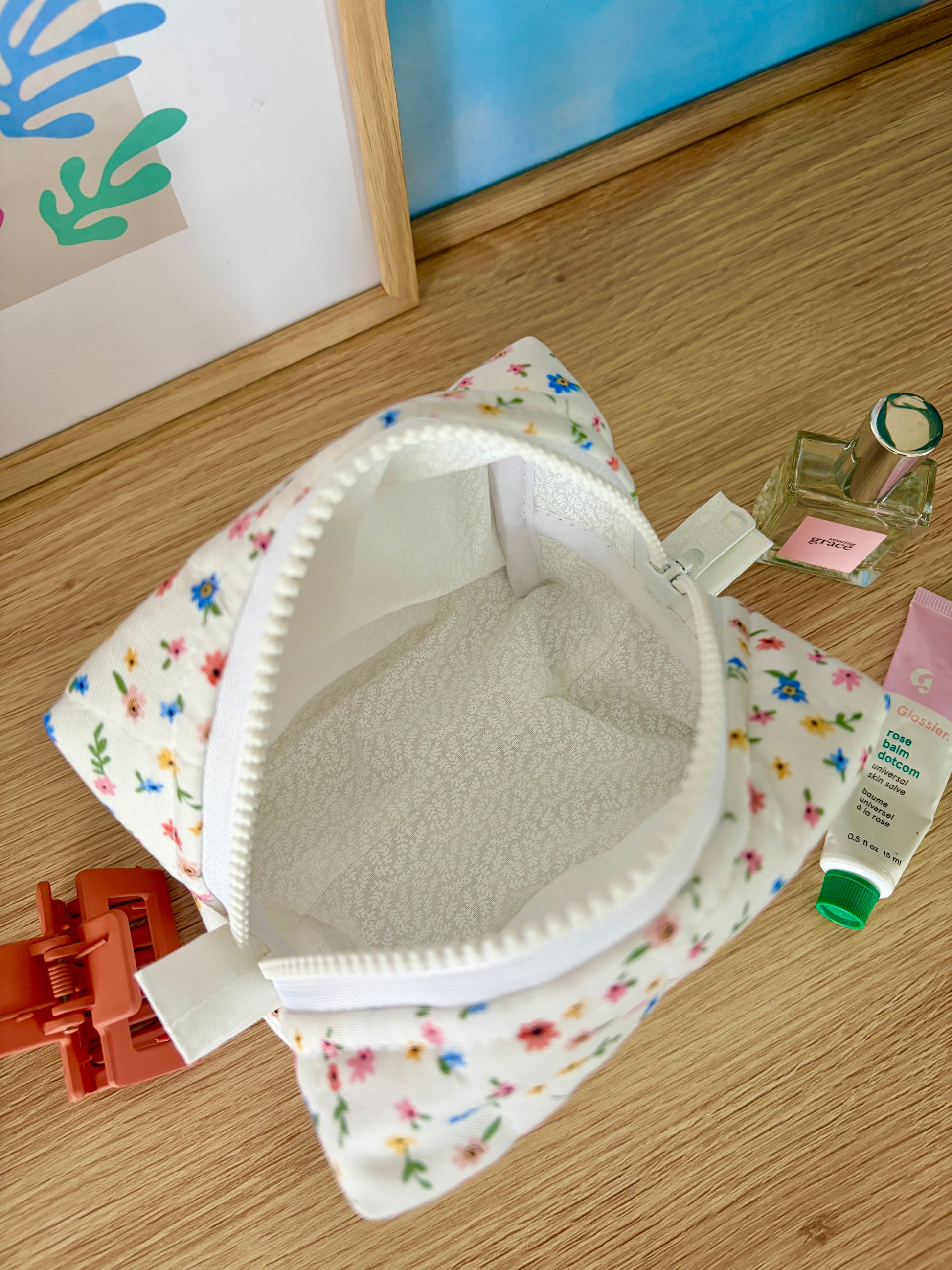 This mini makeup bag is handmade by Xoxo Charley and is perfect for holding your makeup, cosmetics, hair care and more for on the go!