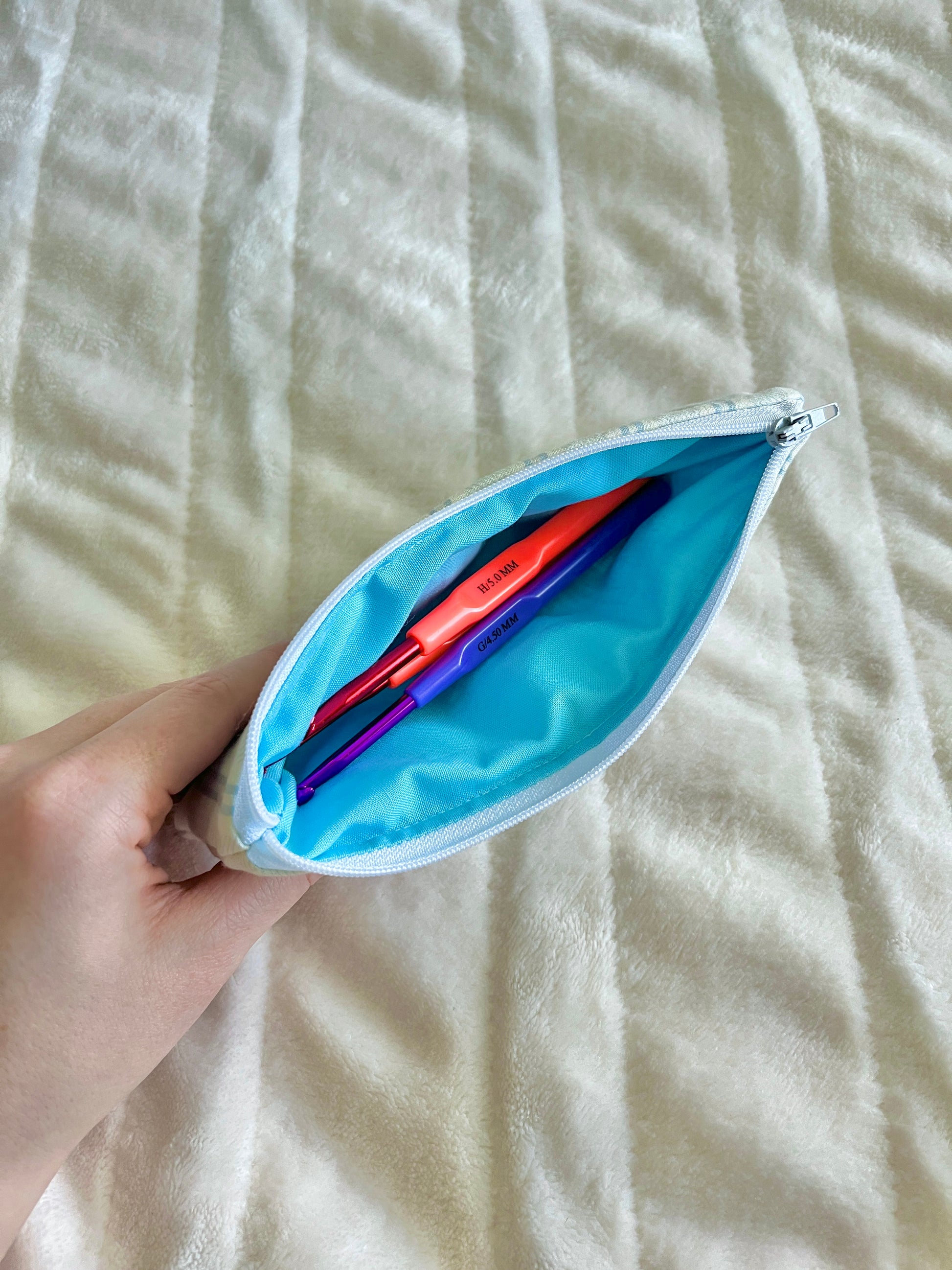 This pretty bag is 100% handmade and is perfect for holding your essentials during school, vacation, and other activities throughout your day!