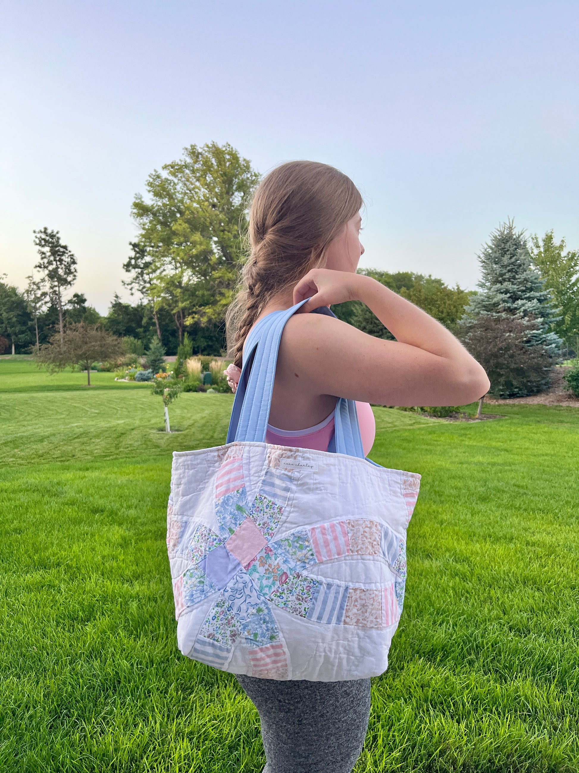 This one of a kind tote bag is 100% handmade and is upcycled from a unique quilt. This tote bag is the essential bag for any errand, workout, trip, and everything in between!