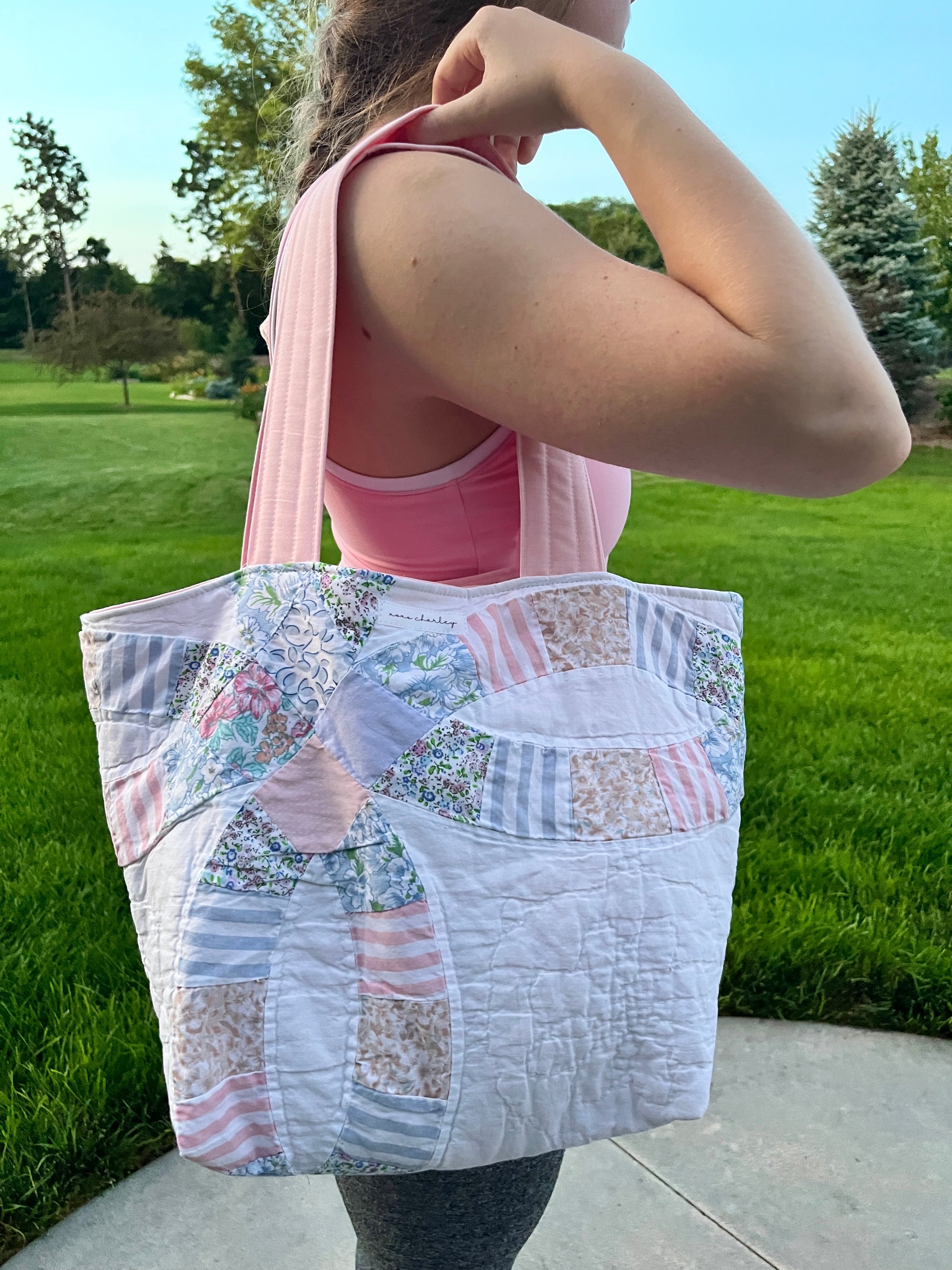 This one of a kind tote bag is 100% handmade and is upcycled from a unique quilt. This tote bag is the essential bag for any errand, workout, trip, and everything in between!