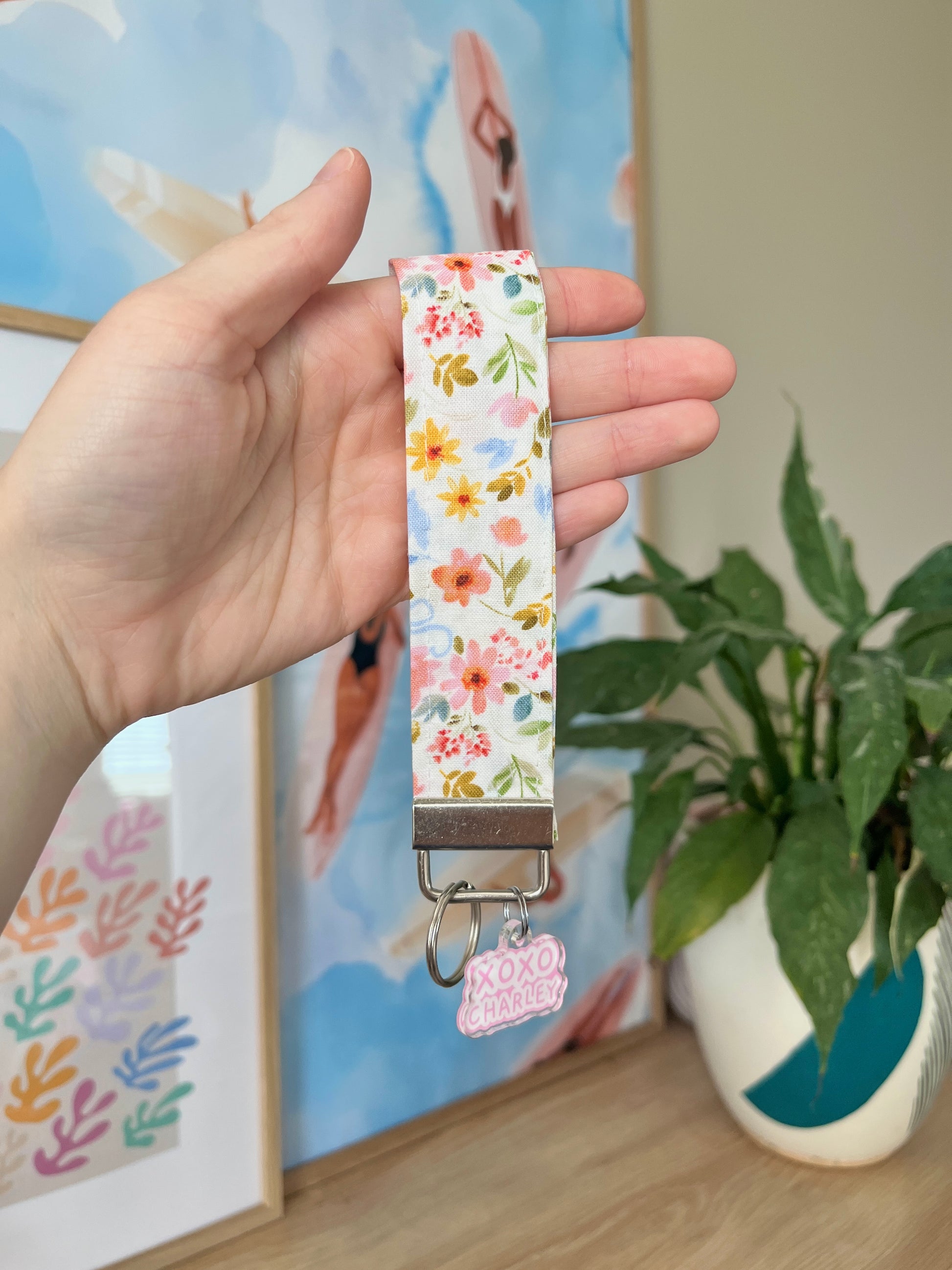 This pretty wristlet is 100% handmade and is perfect for holding your keys, wallet, and other essentials during your daily activities! Wallets not included and are sold separately.