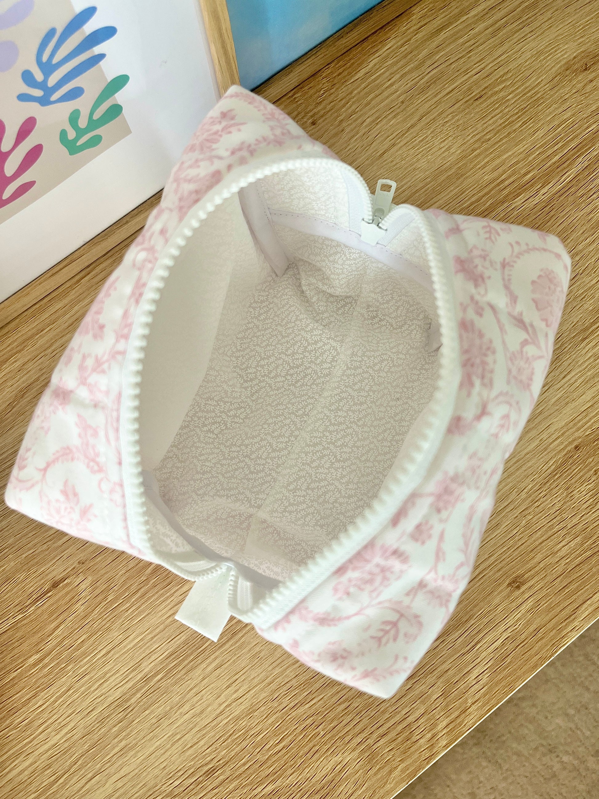 This pretty makeup bag is 100% handmade and is perfect for holding your makeup, cosmetics, hair care and more for on the go!