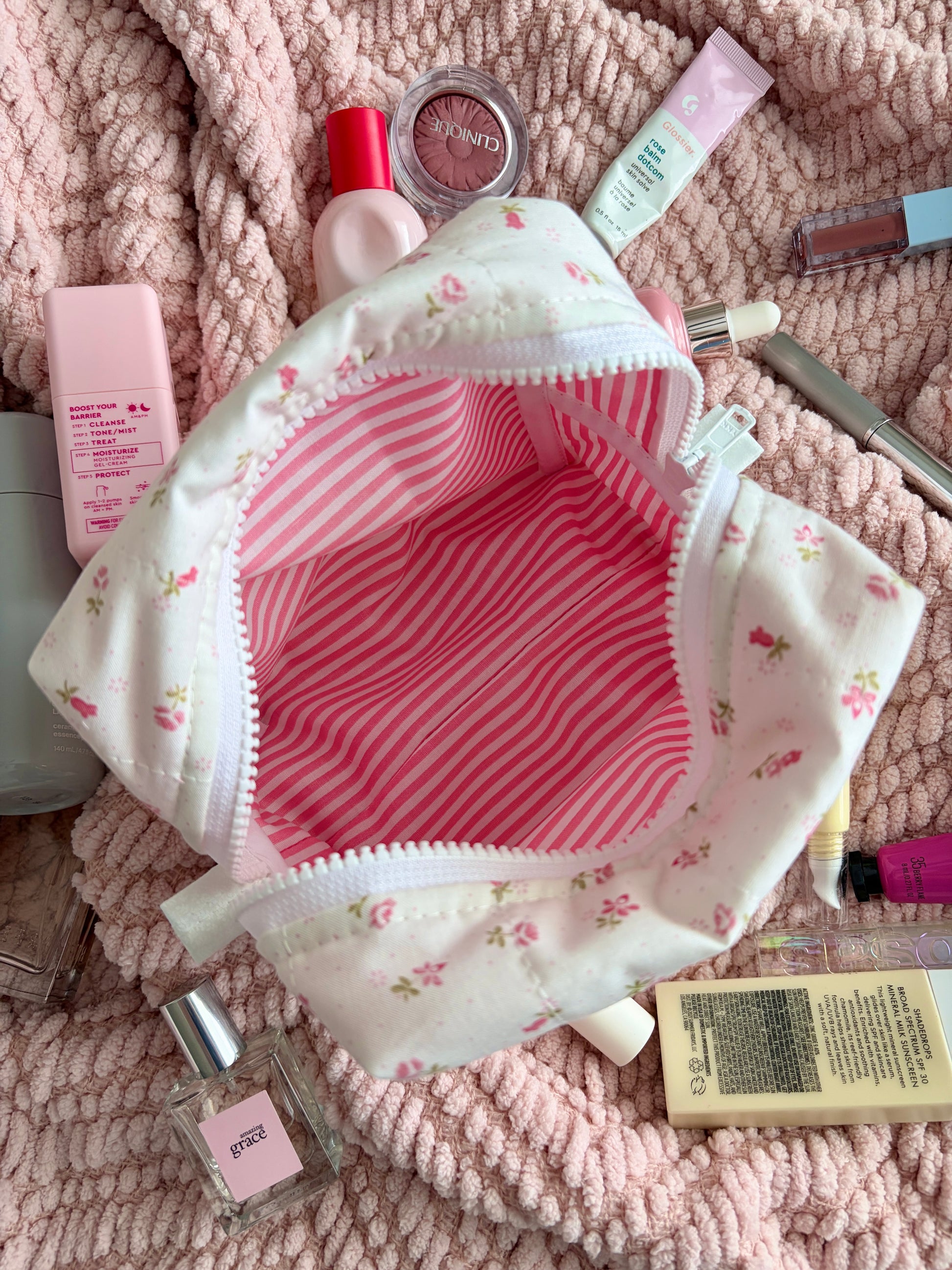 This pretty handmade makeup bag is perfect for holding your makeup, cosmetics, hair care and more for on the go!