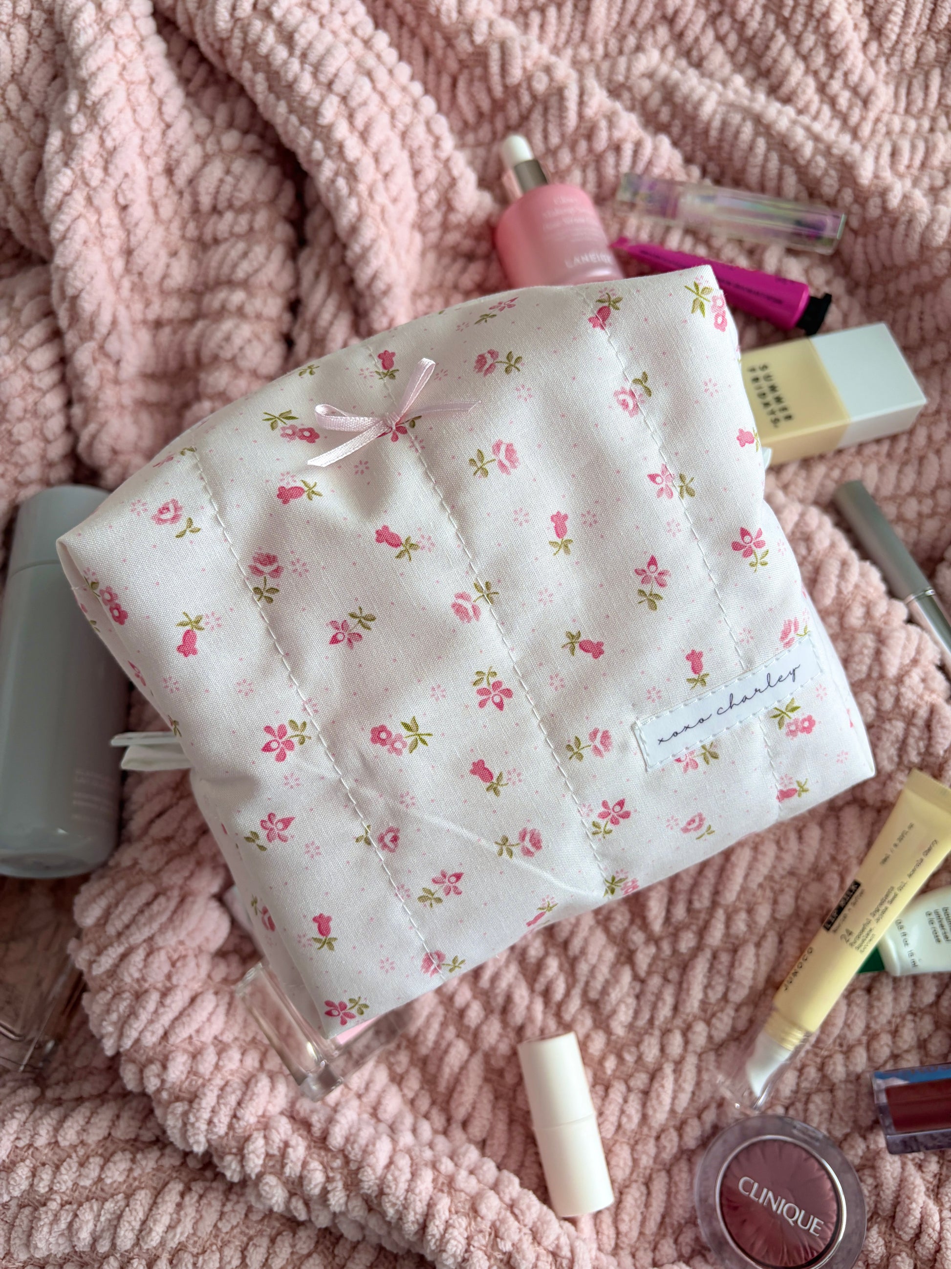 This pretty handmade makeup bag is perfect for holding your makeup, cosmetics, hair care and more for on the go!