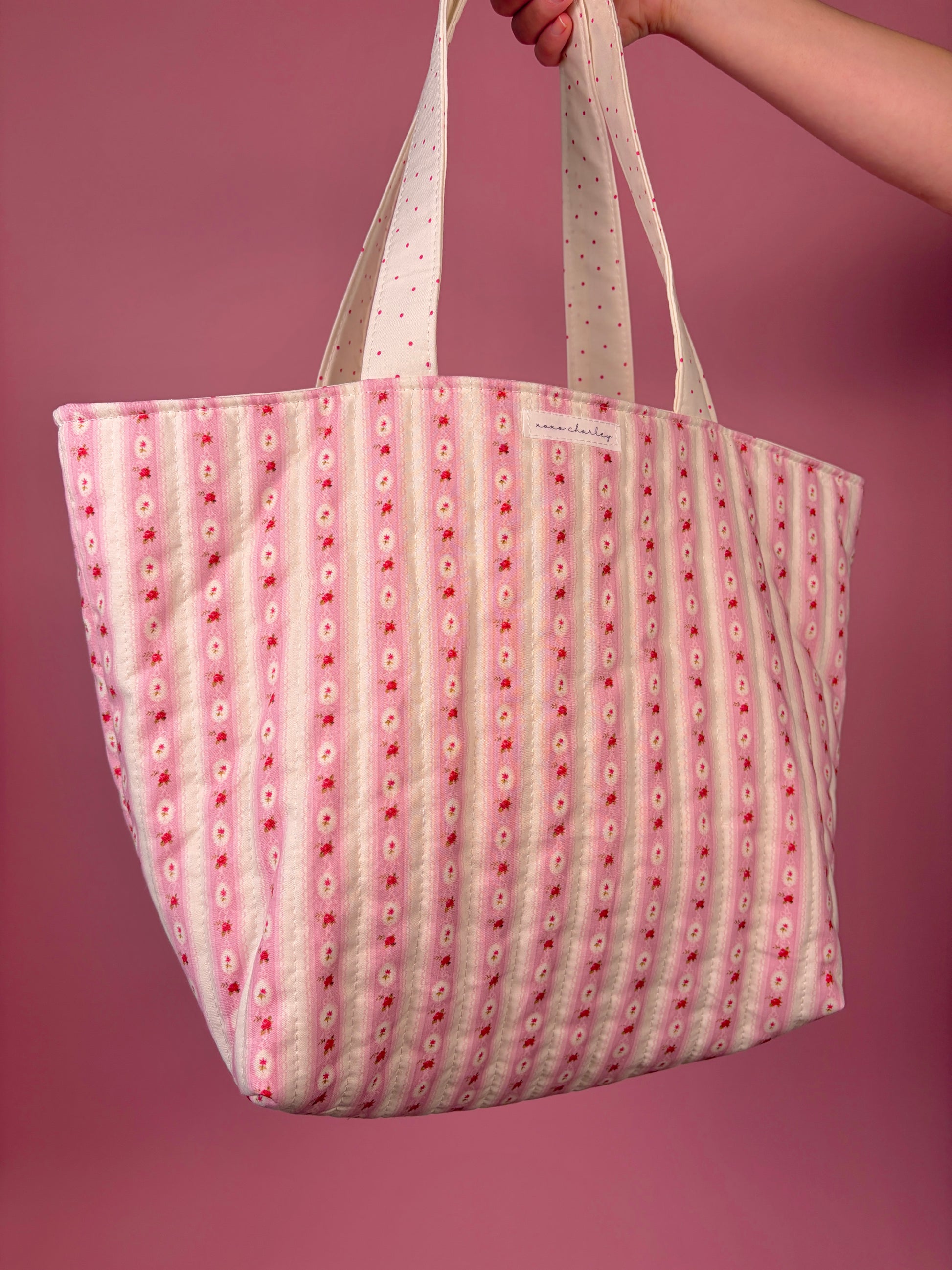 This pretty large tote bag is handmade and is perfect for any errand, workout, trip, and everything in between! It is also a limited-edition, one of a kind bag and will never be restocked.